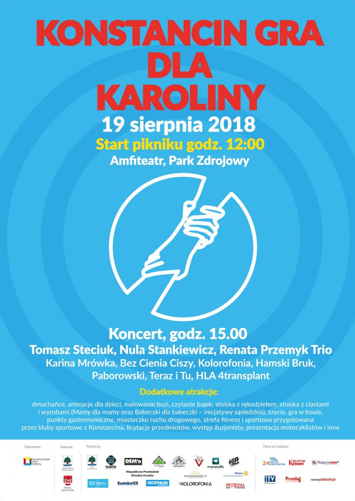 I to właśnie dla Karoliny 19 sierpnia w godz. 12-22 w Parku Zdrojowym w Konstancinie-Jeziornie odbędzie się piknik charytatywny pod hasłem „Konstancin gra dla Karoliny”. Organizatorem imprezy jest Konstanciński Dom Kultury. Występy różnych wykonawców zakończy koncert Renaty Przemyk, która przyjedzie z Krakowa specjalnie dla Karoliny!