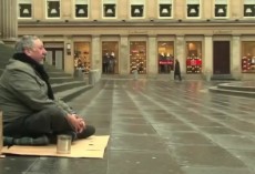 I nagle się zatrzymuje, jakby ktoś albo coś wyrwało ją z letargu codzienności. Odwraca się na pięcie i wraca do siedzącego na mokrych kamieniach mężczyzny. Sięga po karton z napisem i na odwrotnej stronie kaligrafuje jakieś zdanie. Nie widzimy, co pisze. Wreszcie stawia karton przed żebrakiem i bez słowa odchodzi.